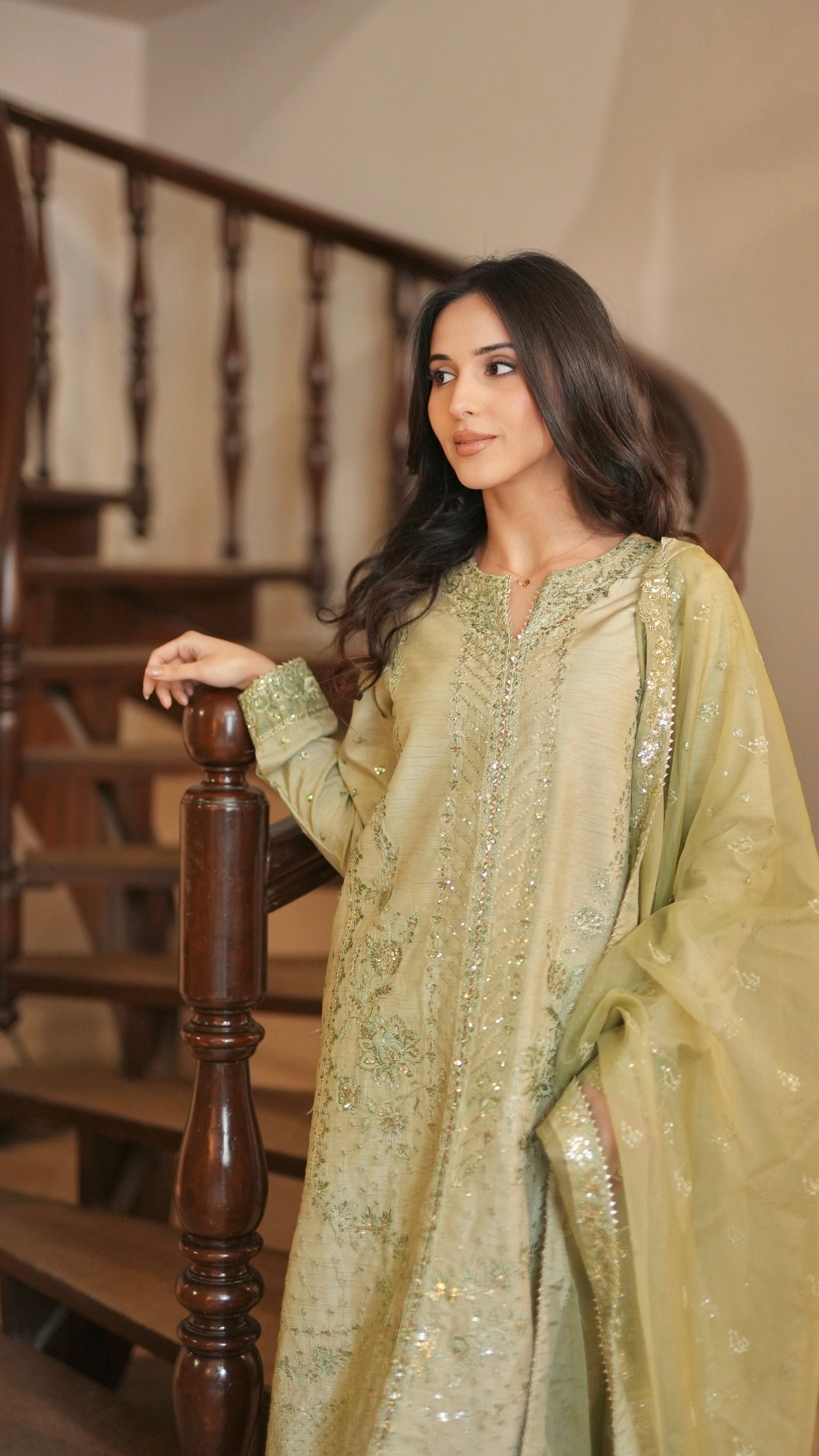 The look is elevated with a statement organza dupatta, delicately adorned with zari, tilla, sequins, and fine thread embroidery. The sheer texture of organza paired with intricate detailing adds lightness and movement, creating a striking contrast against the richness of raw silk.