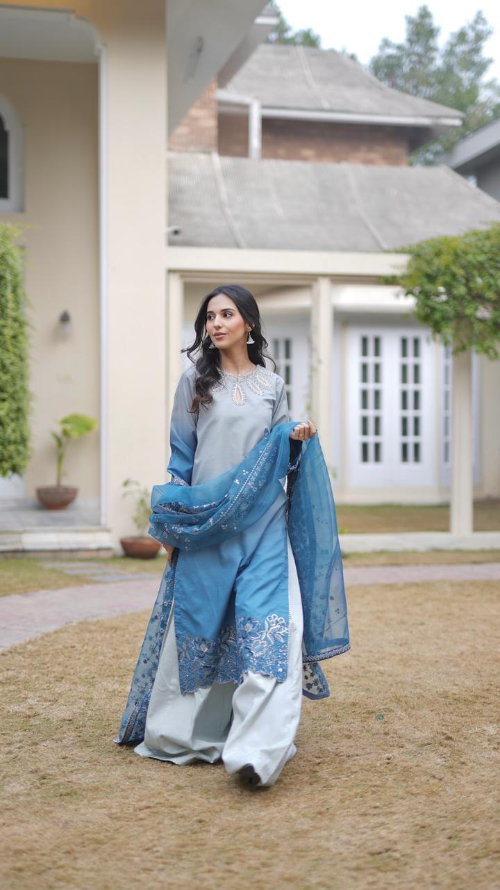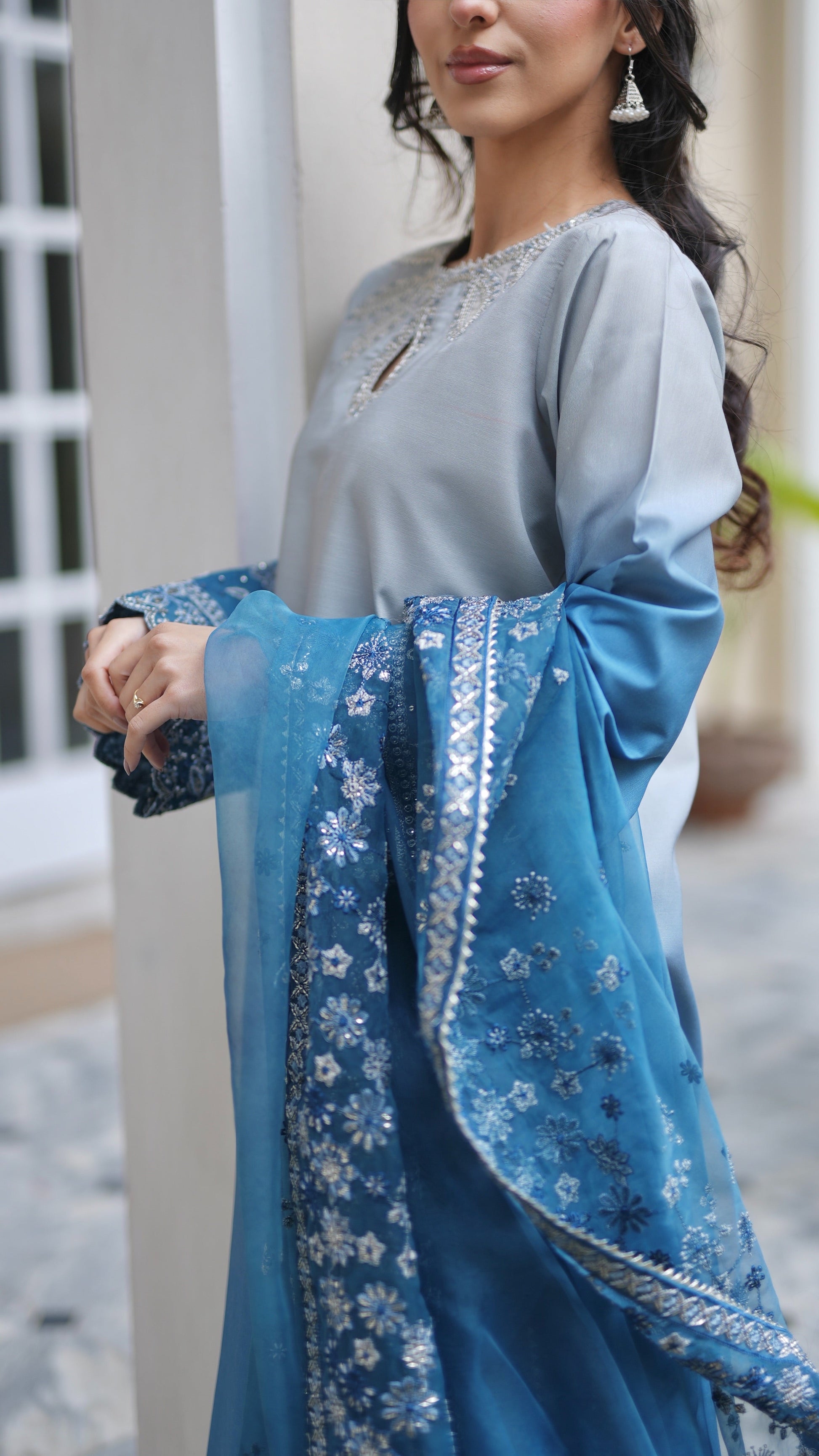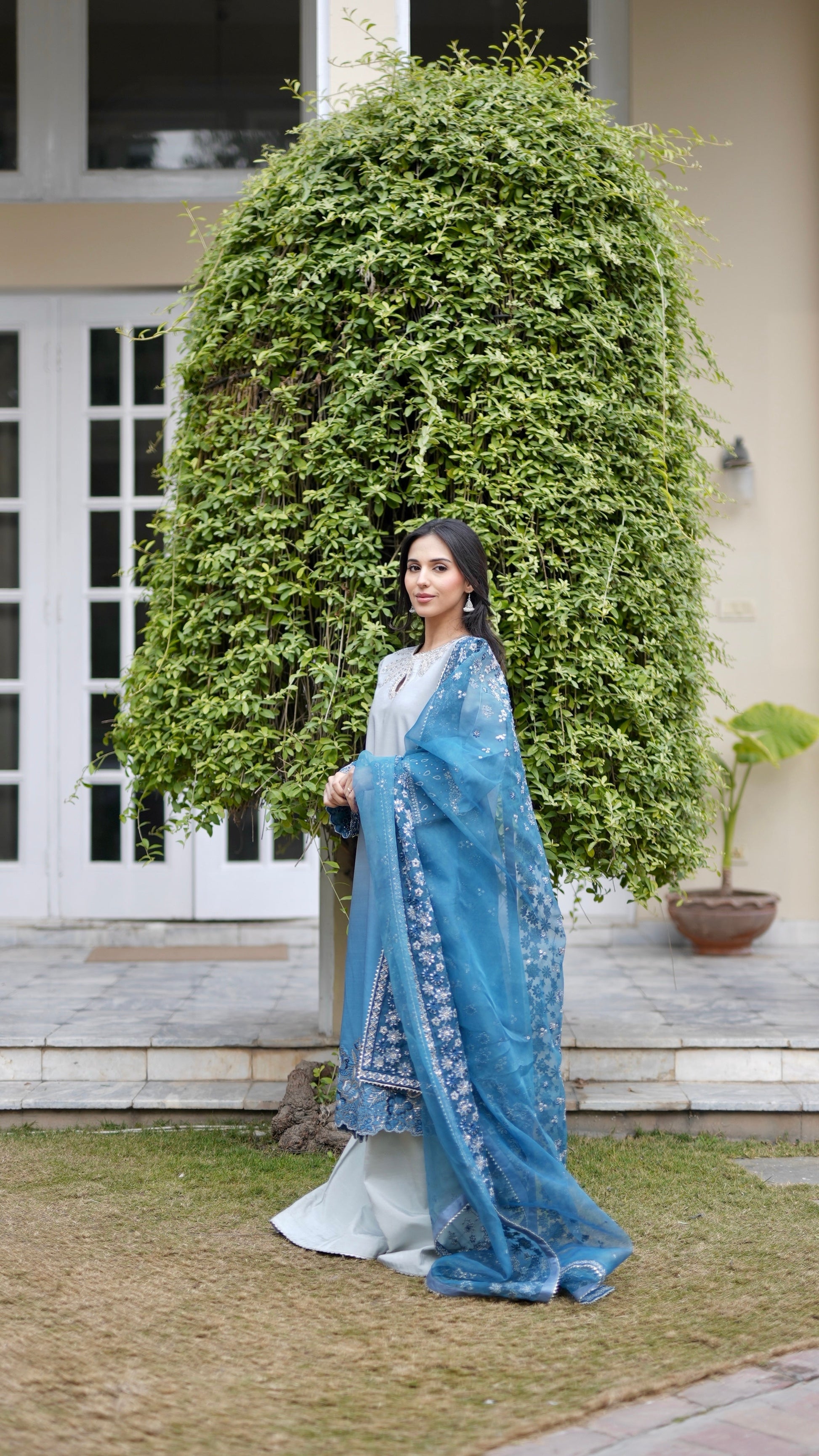 The look is elevated with a statement organza dupatta, delicately adorned with zari, tilla, sequins, and fine thread embroidery. The sheer texture of organza paired with intricate detailing adds lightness and movement, creating a striking contrast against the richness of raw silk.