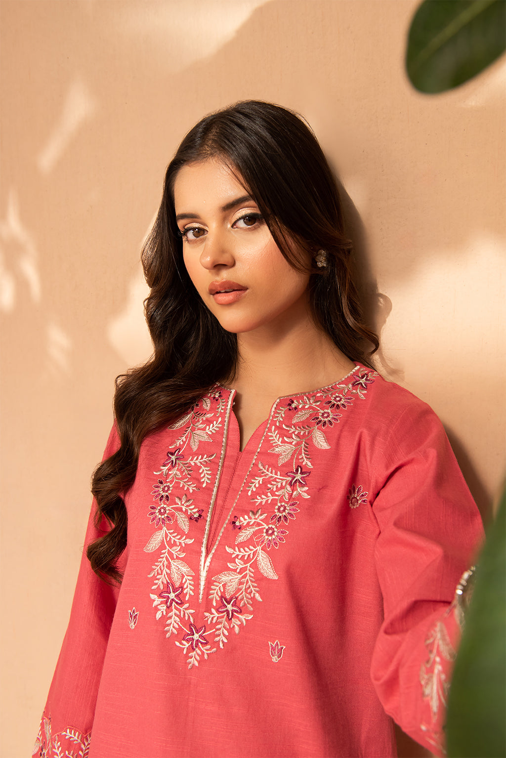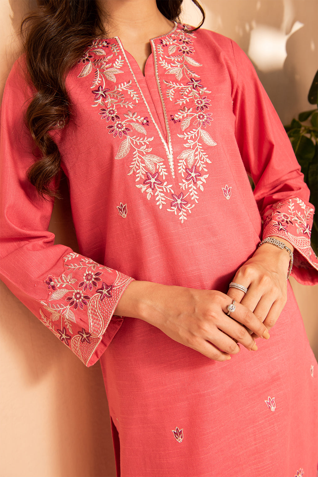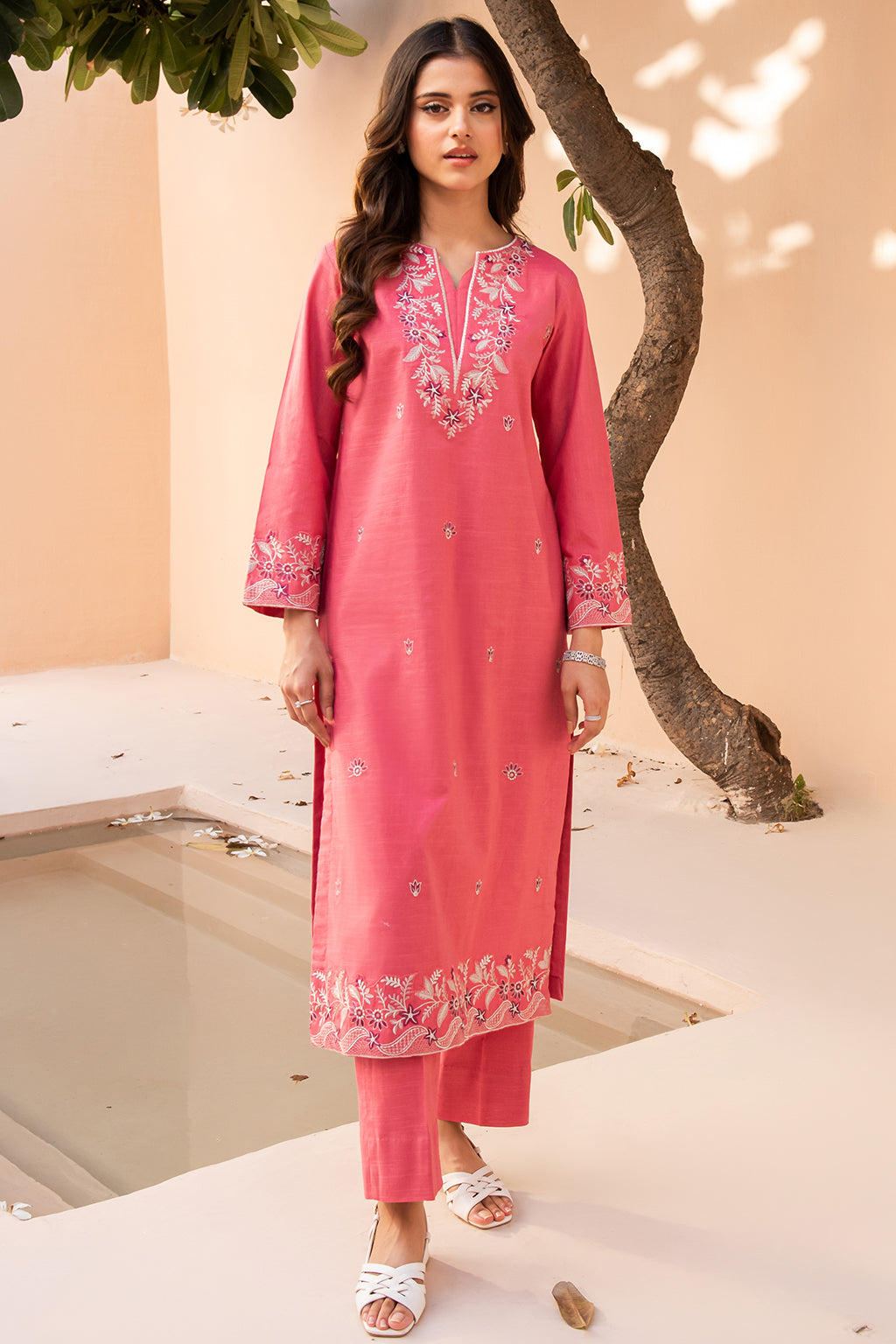 The bright pink khaddar outfit boasts a vibrant appeal with colorful embroidery adorning both the front and sleeves (bazu), creating a visually stunning and lively ensemble.