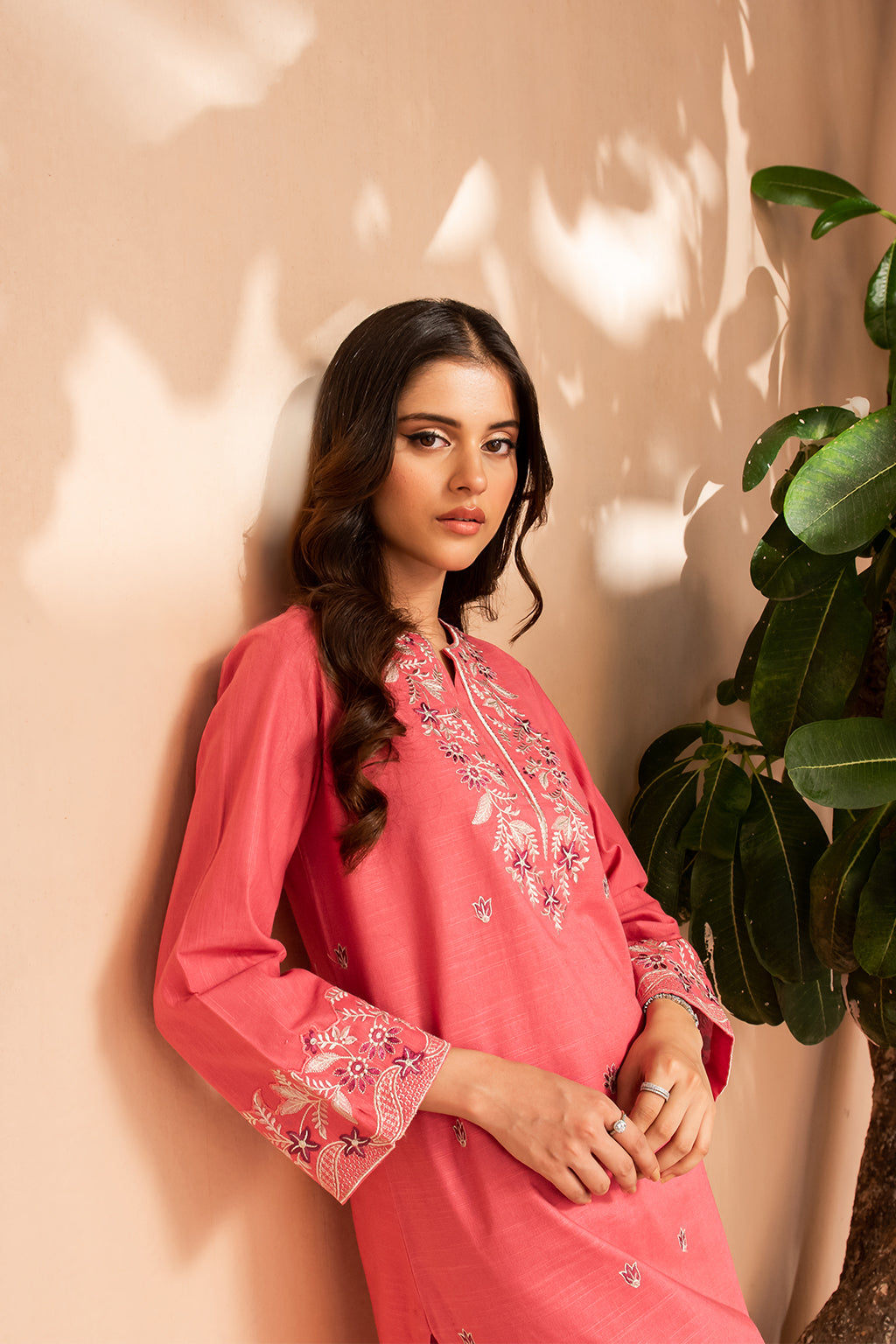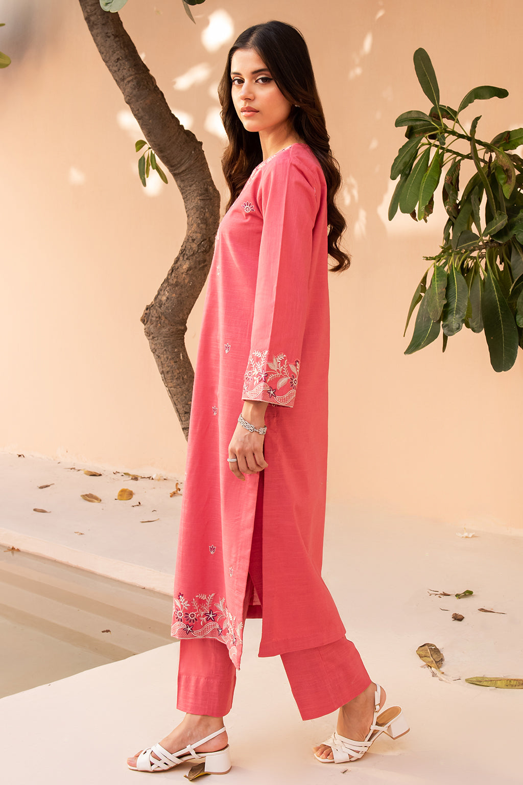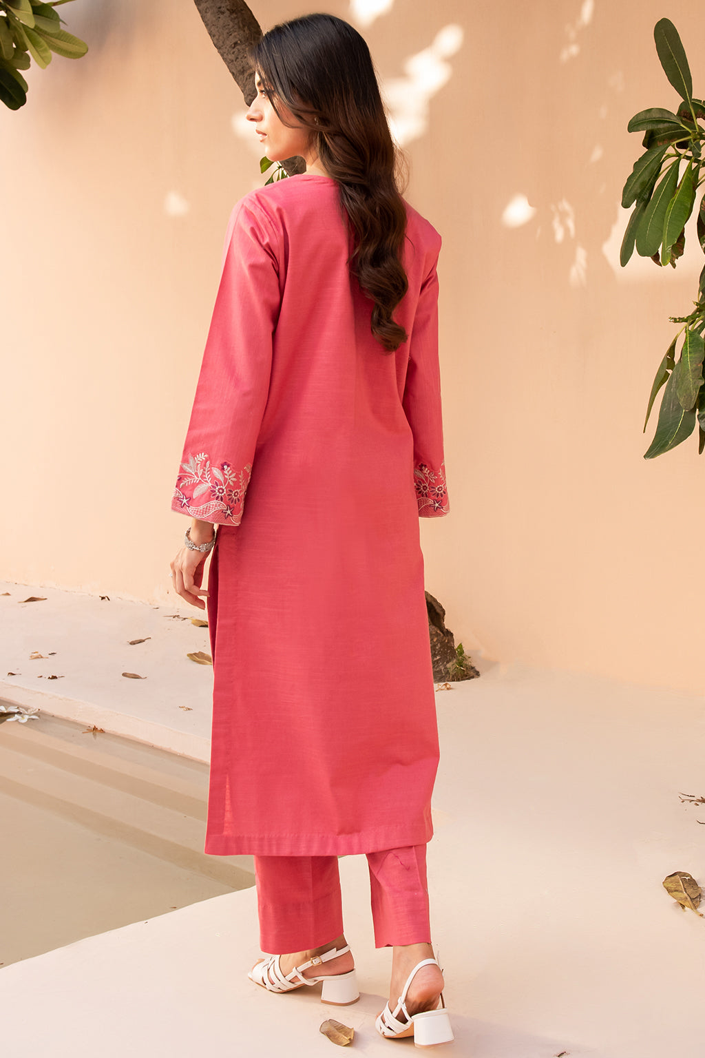The bright pink khaddar outfit boasts a vibrant appeal with colorful embroidery adorning both the front and sleeves (bazu), creating a visually stunning and lively ensemble.
