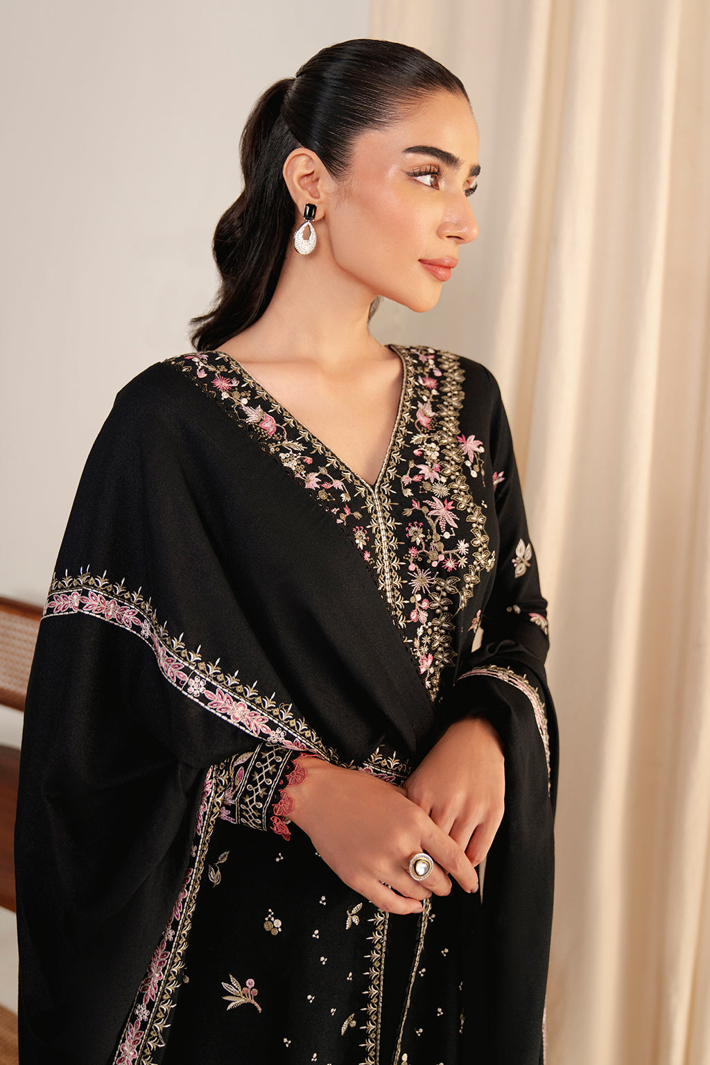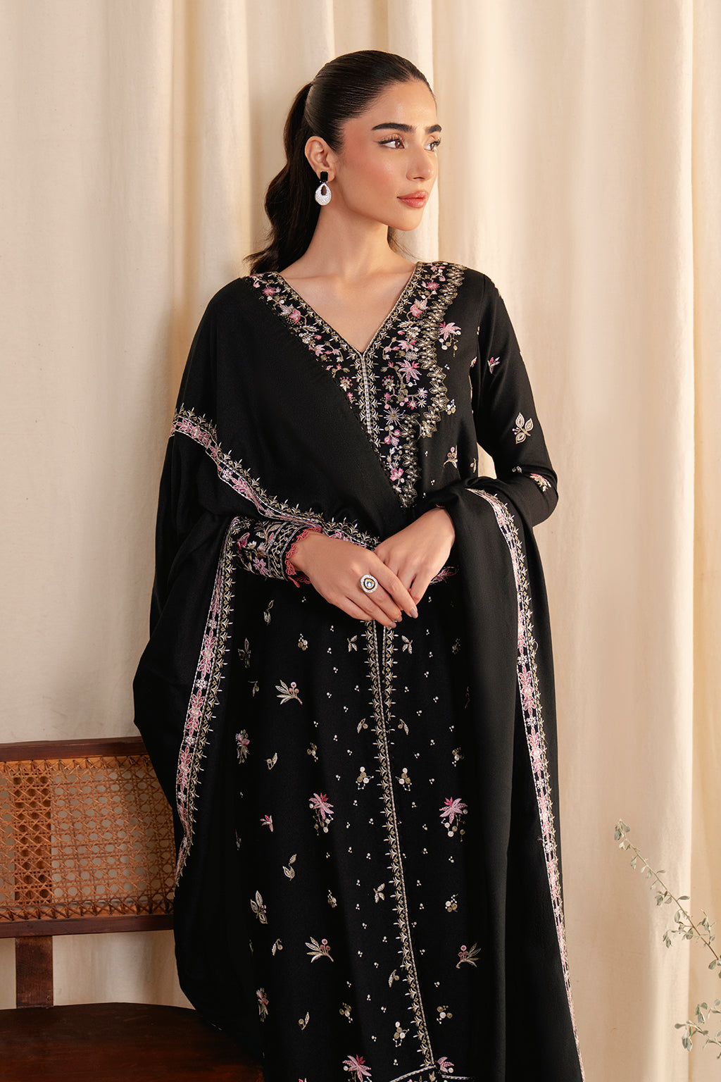 Introducing Noir Garden from the FALL PRET’24 collection, an exquisite black karandi outfit that redefines elegance. The shirt is adorned with intricate multicolored embroidery featuring delicate flowers and enchanting birds in flight, creating a captivating design that celebrates the beauty of nature. Paired with a luxurious black karandi shawl, intricately embroidered with stunning detail and perfectly finished borders, this ensemble is an absolute masterpiece. Perfect for winter gatherings, Noir Garden combines warmth, sophistication, and artistic charm to make a bold yet graceful statement.