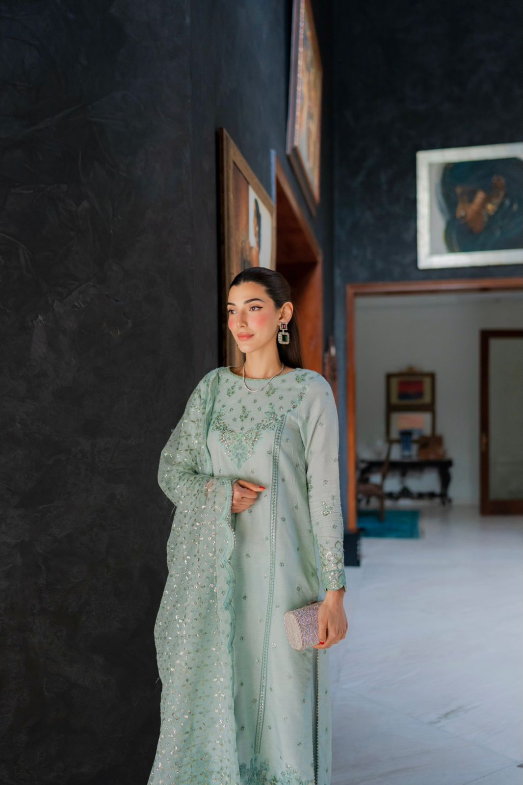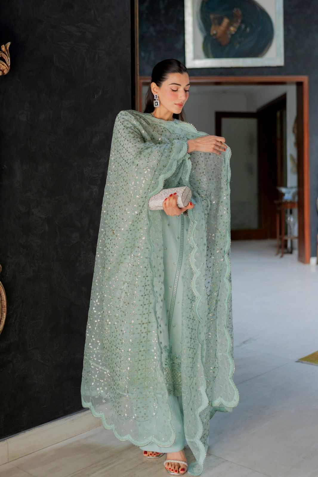 The look is elevated with a statement organza dupatta, delicately adorned with zari, tilla, sequins, and fine thread embroidery. The sheer texture of organza paired with intricate detailing adds lightness and movement, creating a striking contrast against the richness of raw silk.