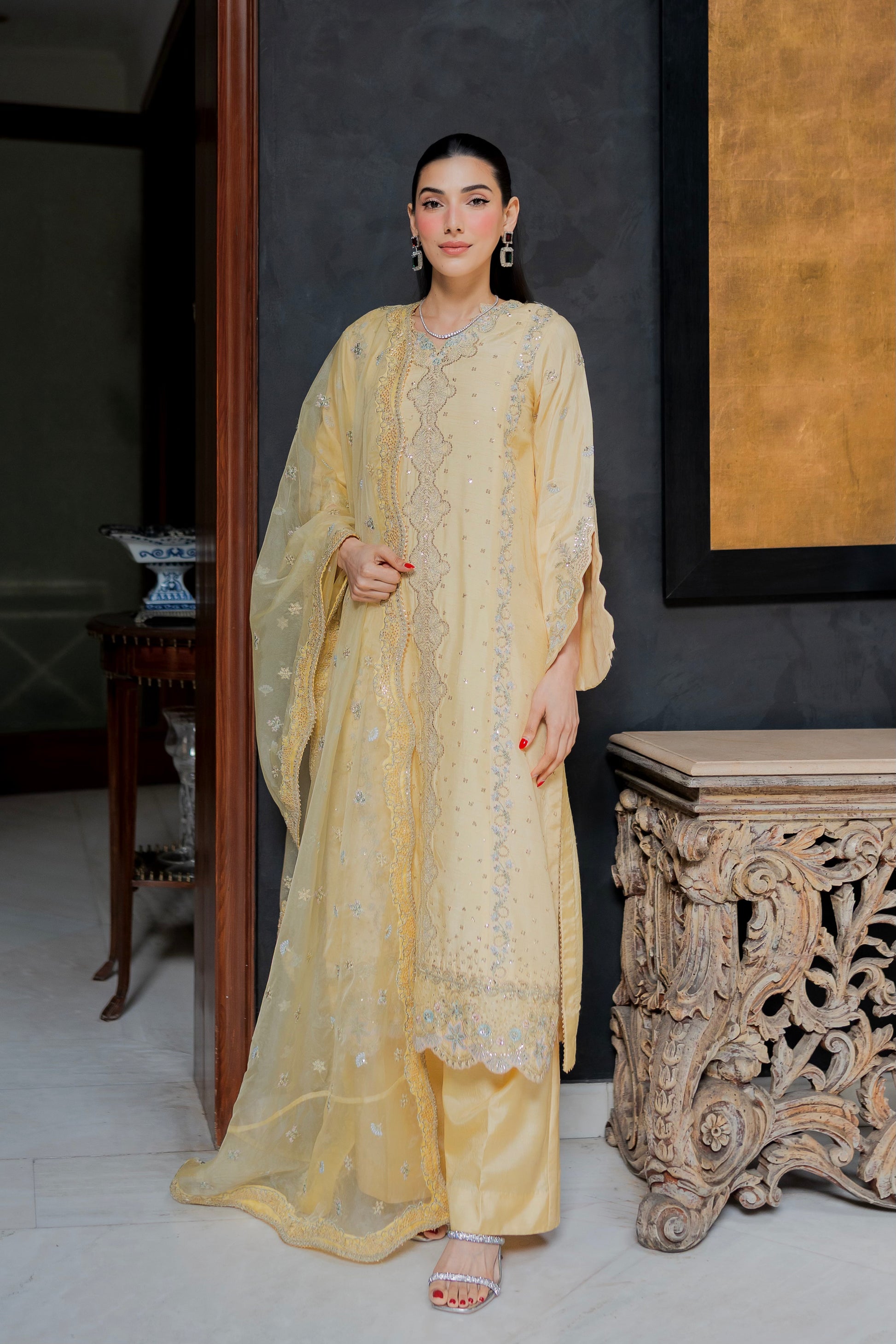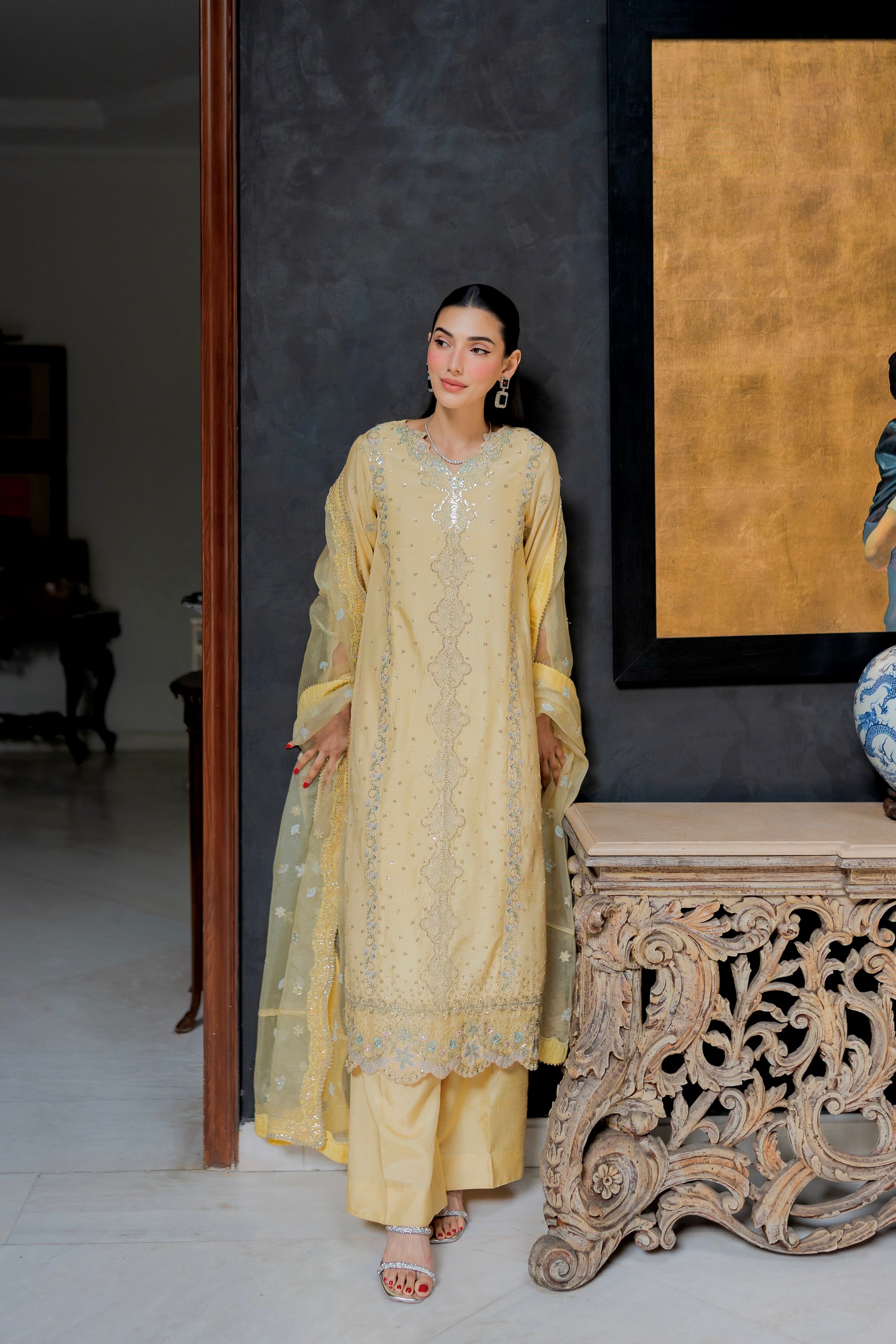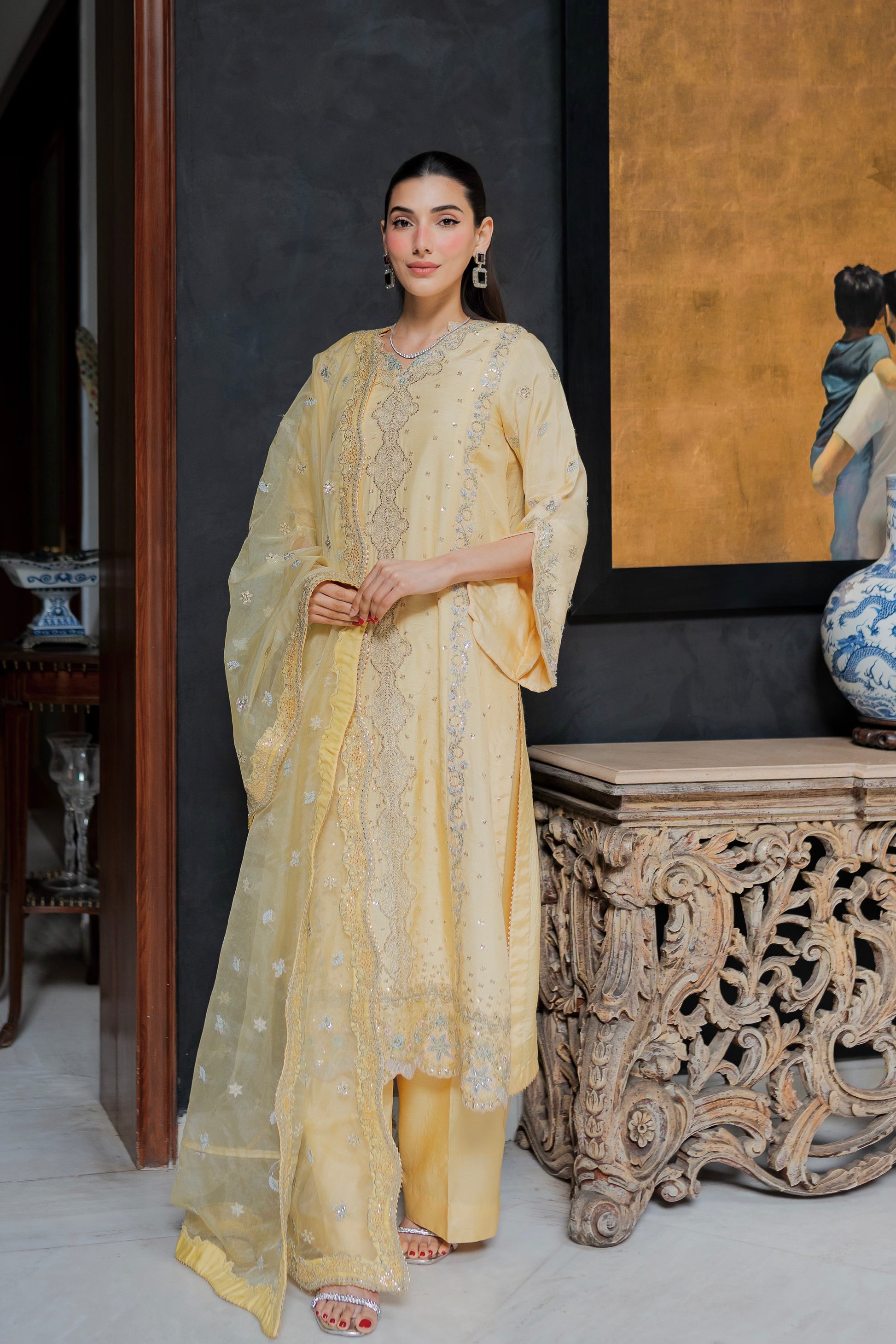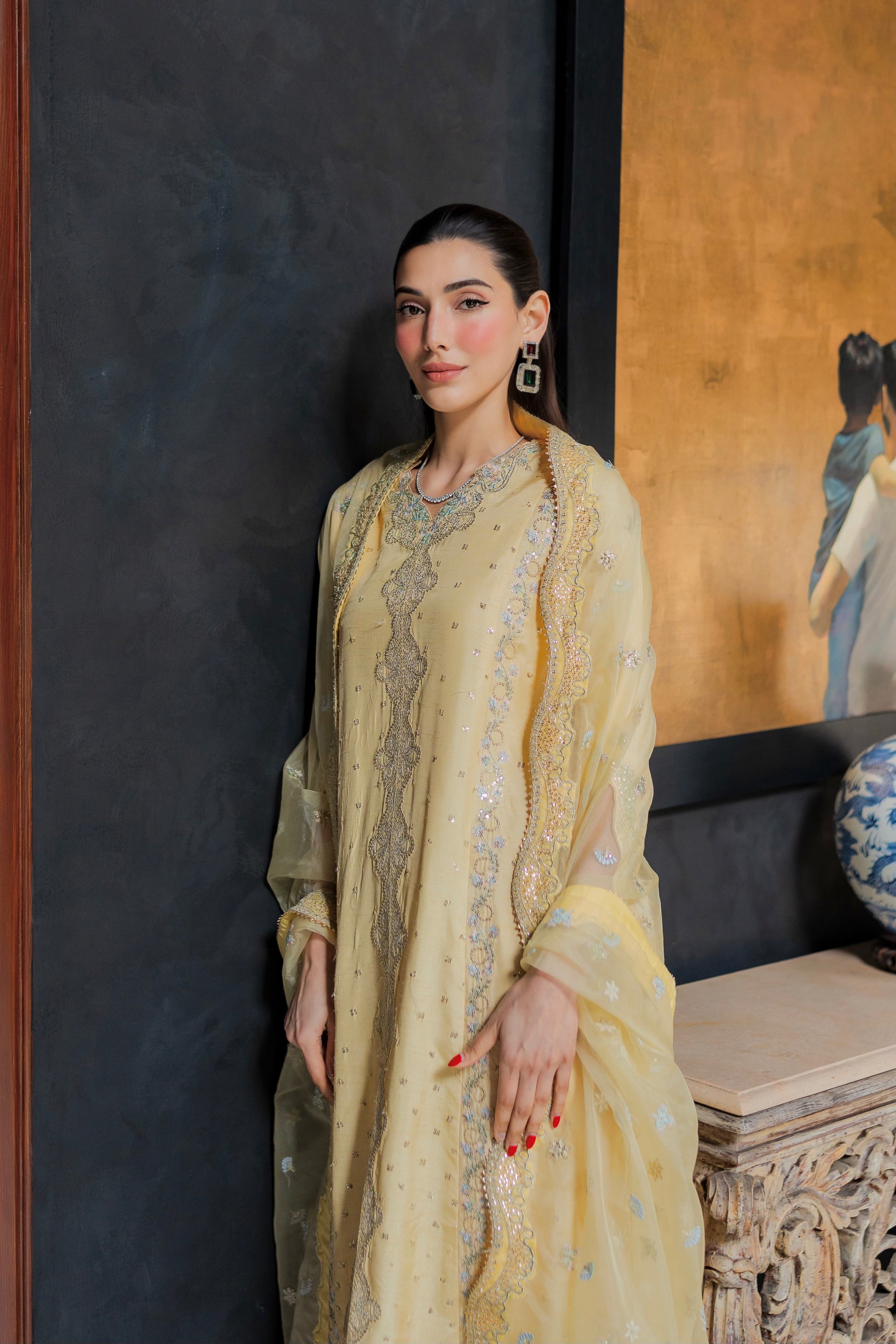 The look is elevated with a statement organza dupatta, delicately adorned with zari, tilla, sequins, and fine thread embroidery. The sheer texture of organza paired with intricate detailing adds lightness and movement, creating a striking contrast against the richness of raw silk.