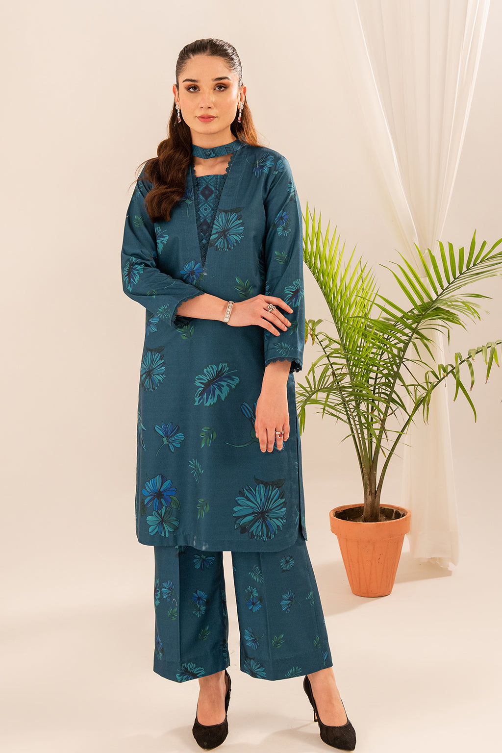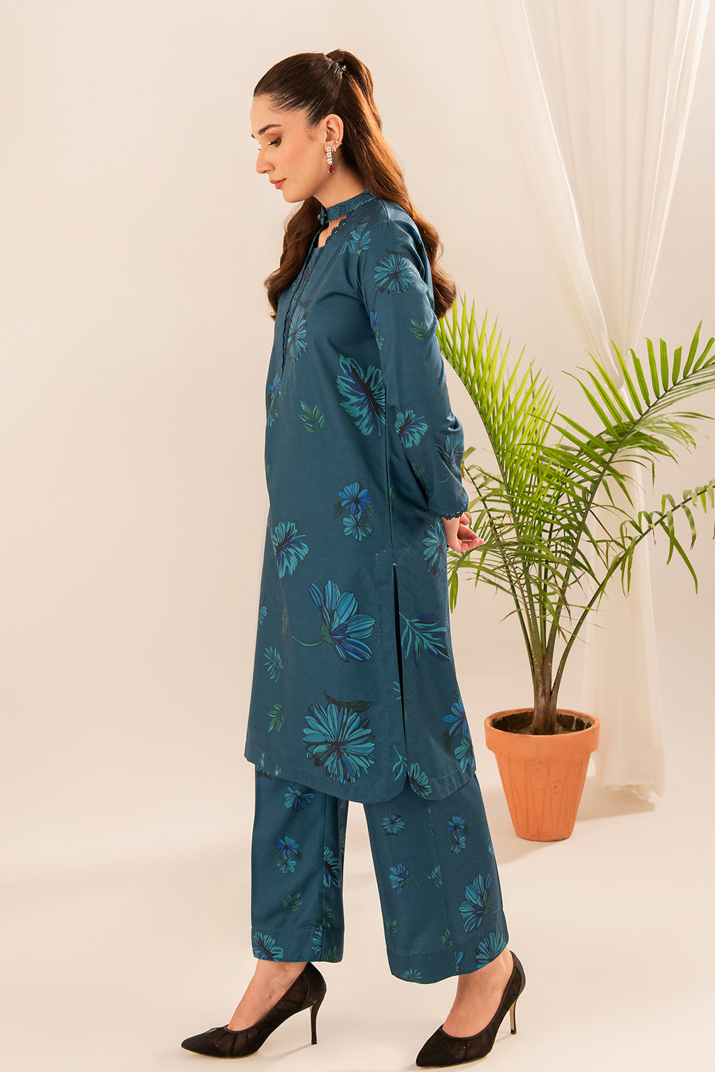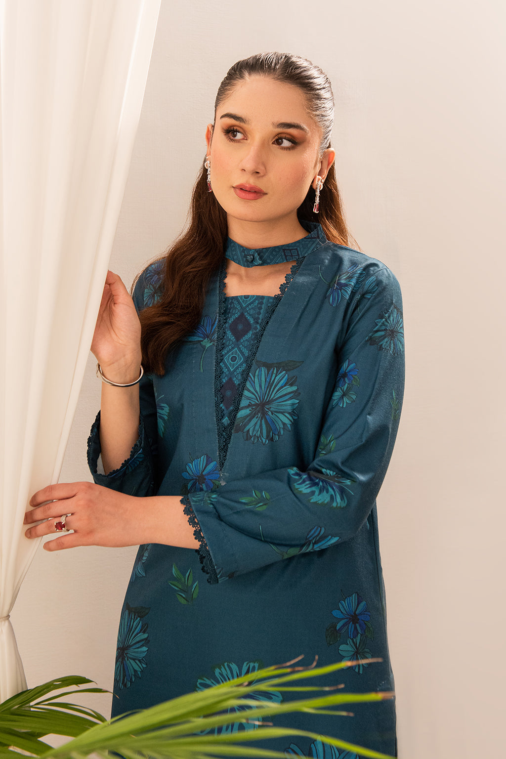 This teal printed article boasts impeccable detailing on the neckline, elevating its style quotient. The subtle and tasteful prints enhance its overall charm without overwhelming the design, making it a versatile and fashionable choice for any occasion.